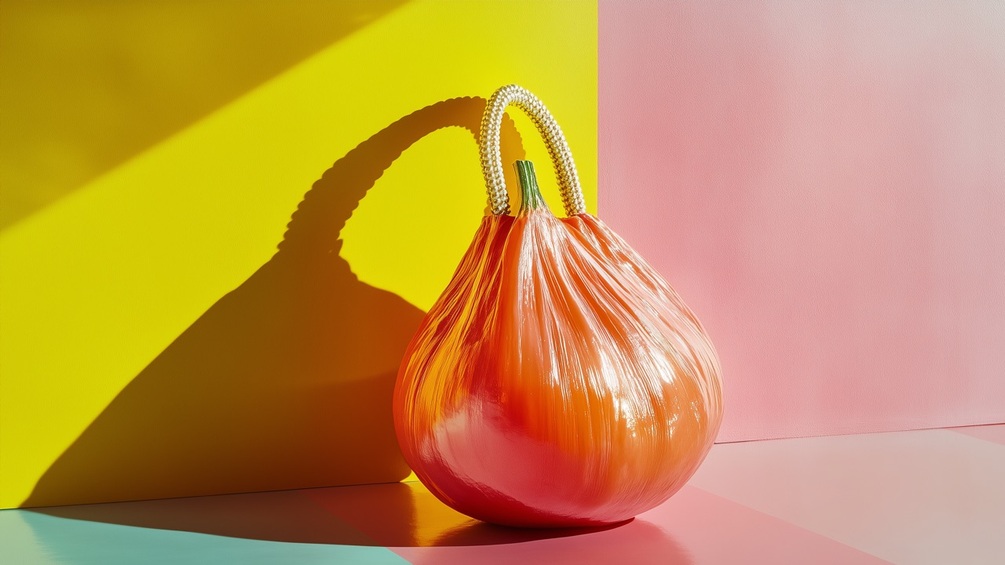 - High-end insane concept of a morphed vegetable bag resting against a beautifully elegant & colourful backdrop